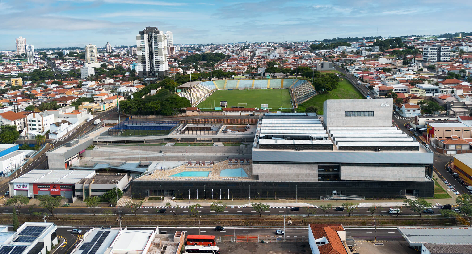Ao invés de fragmentar o projeto em volumes funcionais autônomos, privilegiou-se a concentração dos programas públicos em um único volume, valorizando a diversidade e a densidade das atividades desenvolvidas no SESC. Tal ação favorece a criação de um espaço arquitetônico vibrante de acentuado caráter urbano, tanto pela grande número de atividades simultâneas presentes no edifício, quanto pelo convívio natural entre os usuários de diferentes faixas etárias ou aqueles interessados por atividades variadas.