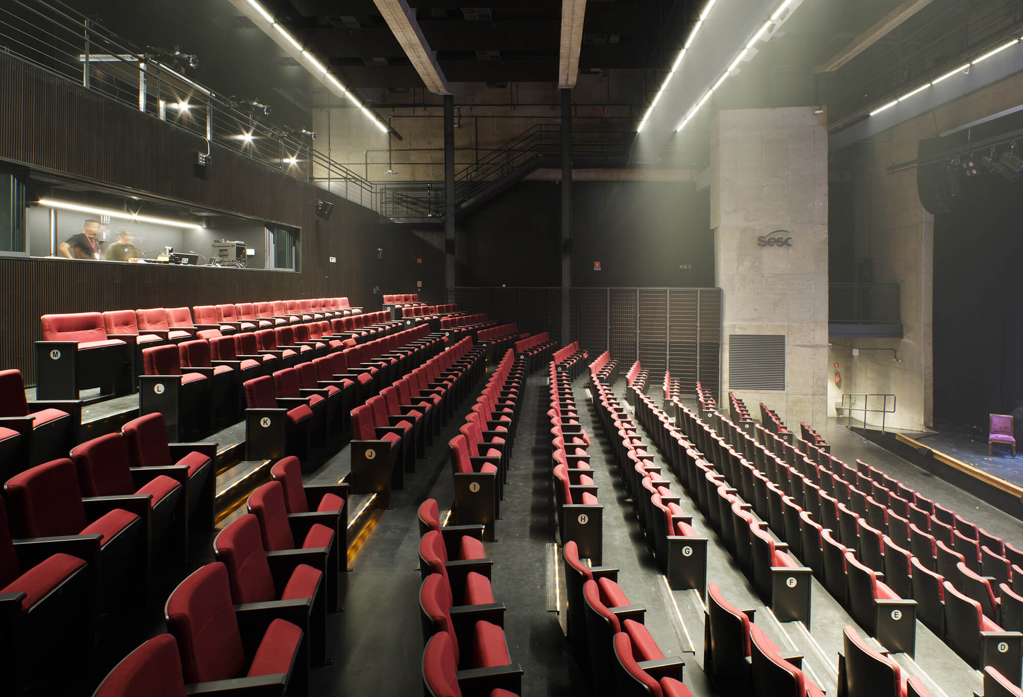 Cota 116.0 – Consolidando a viela entre o terreno do SESC e o Estádio existente, propusemos um acesso independente ao teatro, de onde se pode acessar os balcões do auditório, bem como as cabines de som e imagem. Está previsto também acesso independente à arquibancada posicionada ao lado do Campo de futebol society e da quadra poliesportiva.